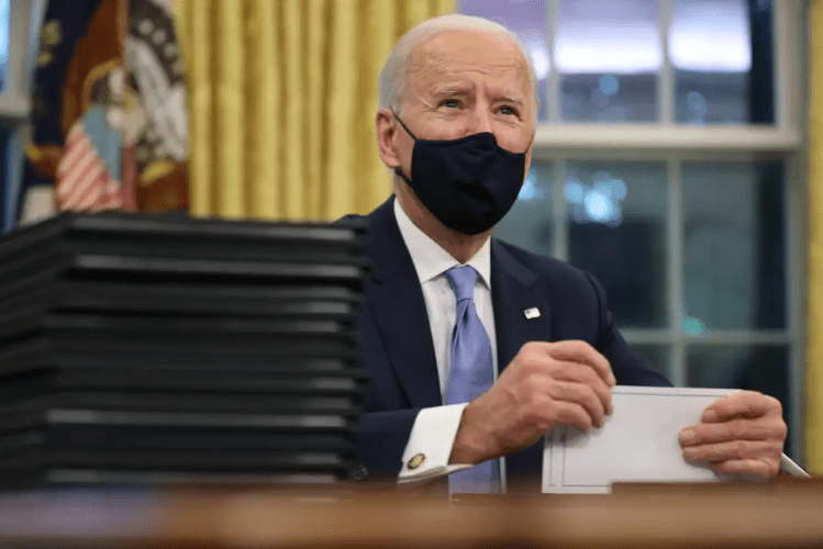 President Biden pictured with a stack of executive orders on his desk within hours of his inauguration.
