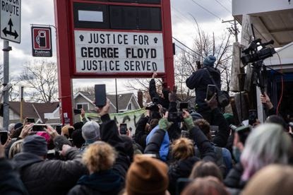A group of protestors gathers beside a sign that reads “Justice for George Floyd Justice Served” after receiving news of the jury’s verdict for the George Floyd case.