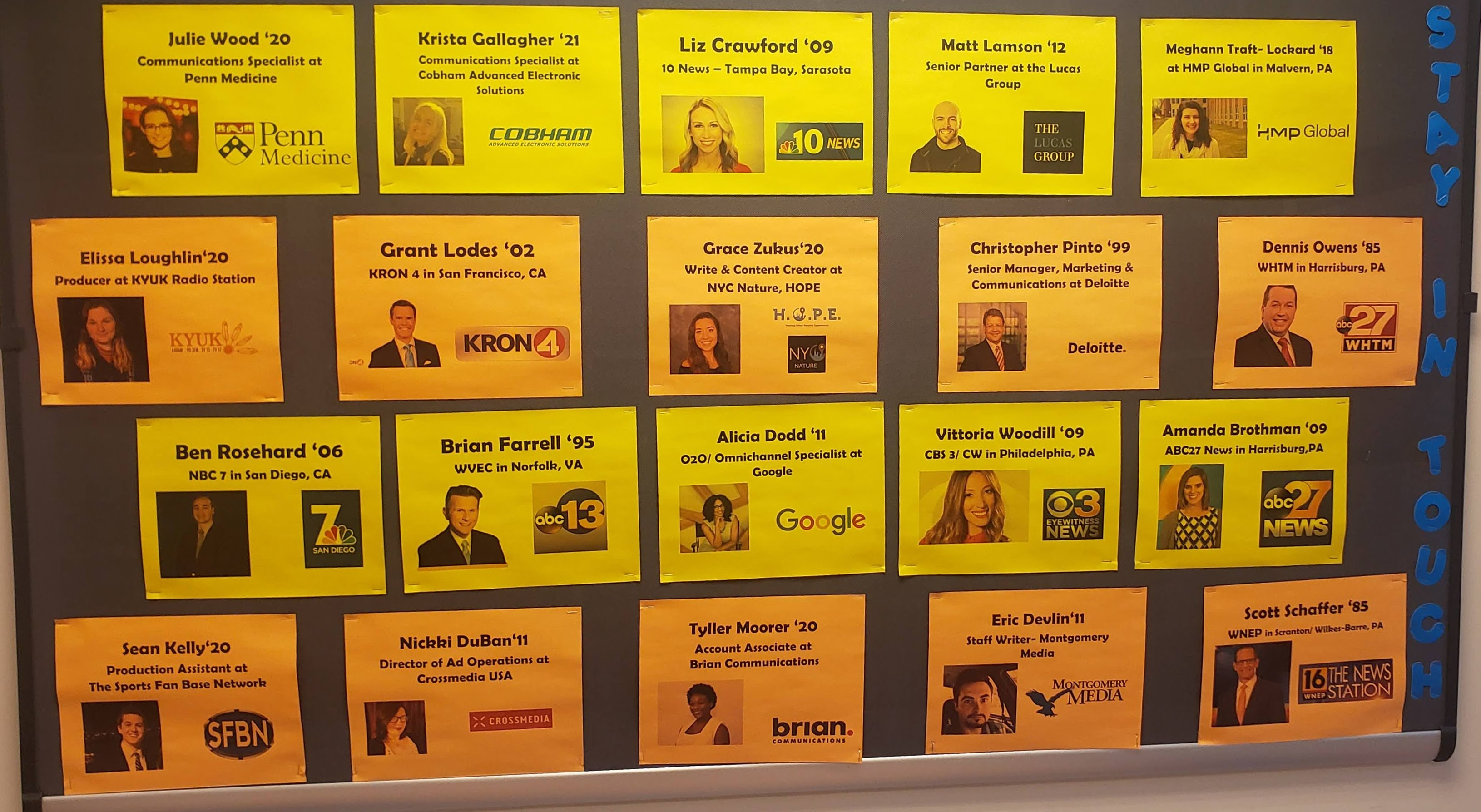The walls of the Com Center are lined with success stories of alumni that have moved into jobs in media, public relations, news, creative writing fields, technical writing fields, interpersonal communication and counseling-related jobs and many, many more. Former editors for the Collegian make up parts of these walls, and others make up parts of our news influences at local and regional outlets like ABC10 and the Philadelphia Inquirer.