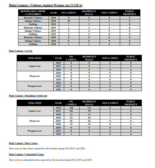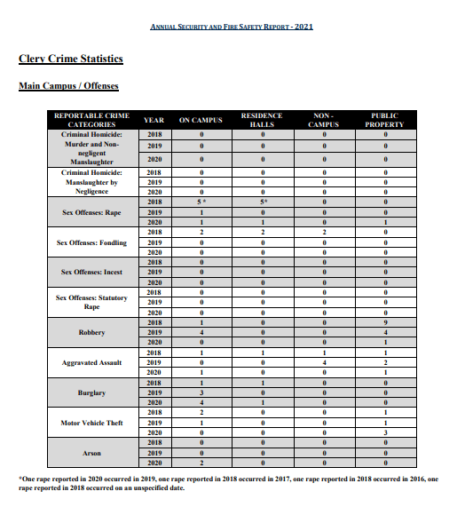 Here is the table of Clery Crime Statistics for 2018 – 2020 at Main Campus.
