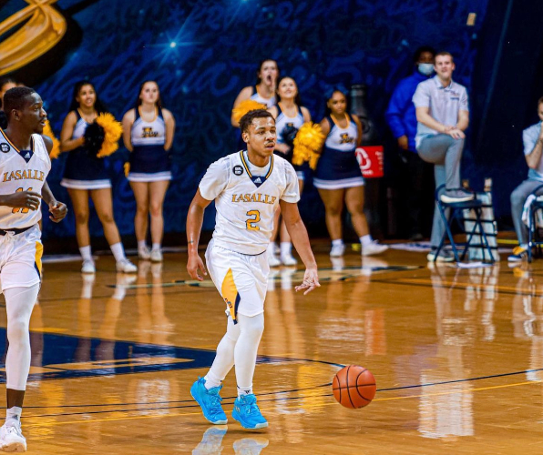 Jhamir Brickus dribbles the ball up the court in La Salle’s 75-64 win over the George Washington Colonials. (courtesy of doms.pov)