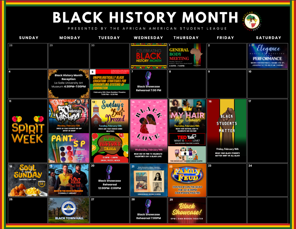 The African American Student League (AASL), along with other collaborating organizations, aims to actively carry on the celebratory legacy here at La Salle through a plethora of events, spirit week activities and educational programs for all students and administration to get involved in and enjoy. Some events include interactive panel discussions, arts and crafts, trivia games, art shows, student performances, tasty treats, savory eats and more. To keep track of all upcoming events, refer to the Black History Month calendar for all important dates.