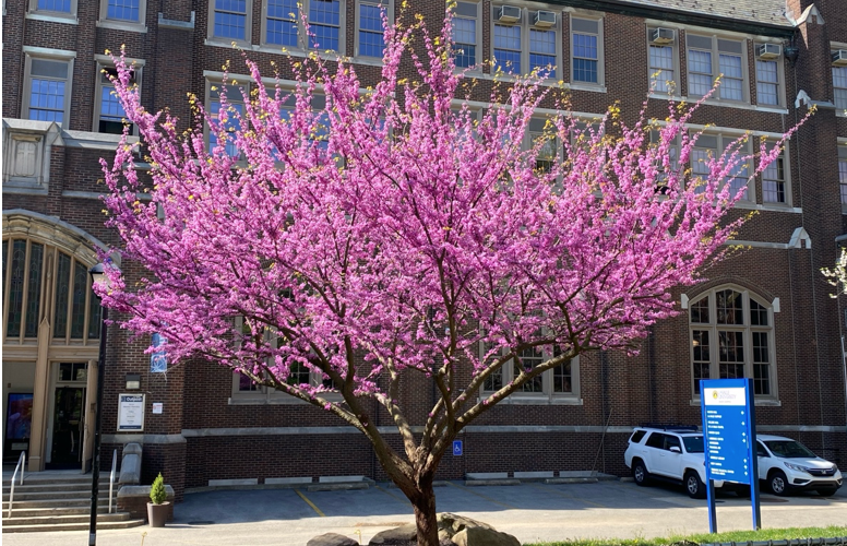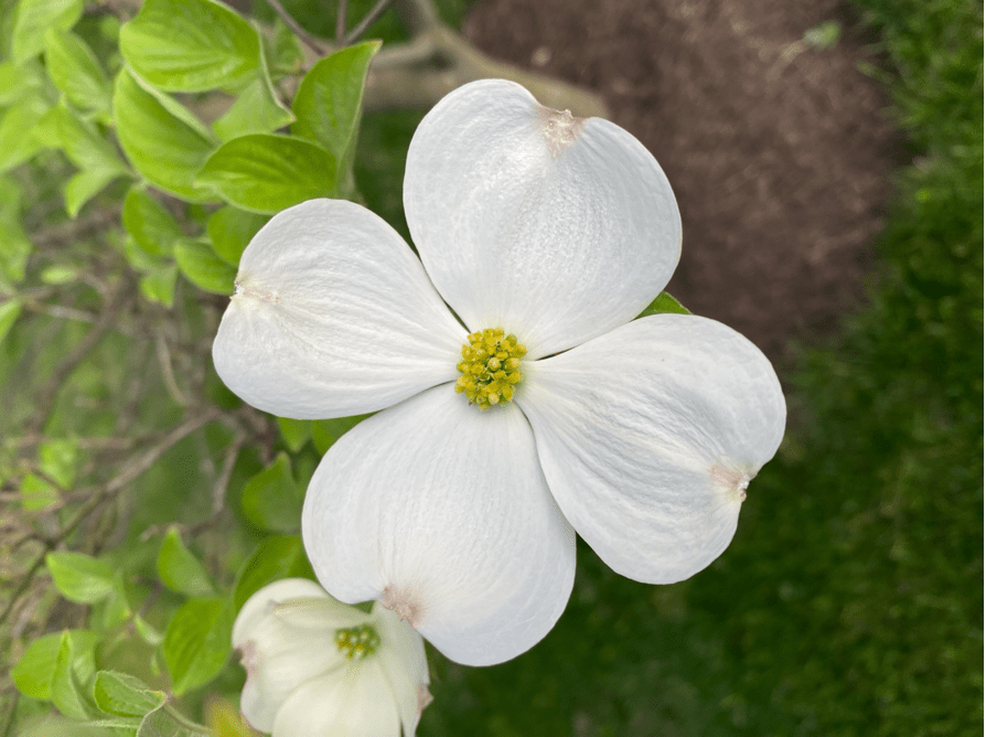 Finally, the last flower we’ll learn about also comes from a flowering tree and is often regarded as the most beautiful native flowering tree in all of eastern North America. It is the one and only flowering dogwood. Each spring, these small, lovely trees produce showy flowers from a spreading crown of branches. The flowers consist of a cluster of greenish-yellow petals surrounded by four showy bracts that come in white or pink. The flowers also attract bees, flies and butterflies. Here on campus, flowering dogwoods can be seen growing near St. Benilde Tower and along the path down to the Communication Center. There are also a few growing near the Independence Blue Cross Fitness Center and the gazebo.