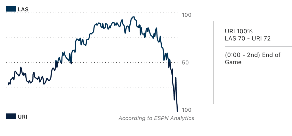 The second half is where the game fell apart for the Explorers, as it seemed like their performance in the first half managed to overinflate their egos. The Explorers were able to extend their lead to 14 points three separate times. This, however, was not enough to seal the game away for the Explorers. In the game’s last four minutes, the Explorers failed to score any points for three minutes straight while also failing to make any defensive stops against the Rams. At one point during this drought, Nickleberry was able to get a takeaway, running away with the ball. Nickleberry, however, failed to score the wide-open basket and gave a defensive rebound for the Rams, who were able to convert the rebound into points, bringing them to 64-64. The Rams maintained this momentum and finished the game with 72 points while only allowing 70 points. The following graph, provided by ESPN, showcases the probability of the Explorers winning the game.
